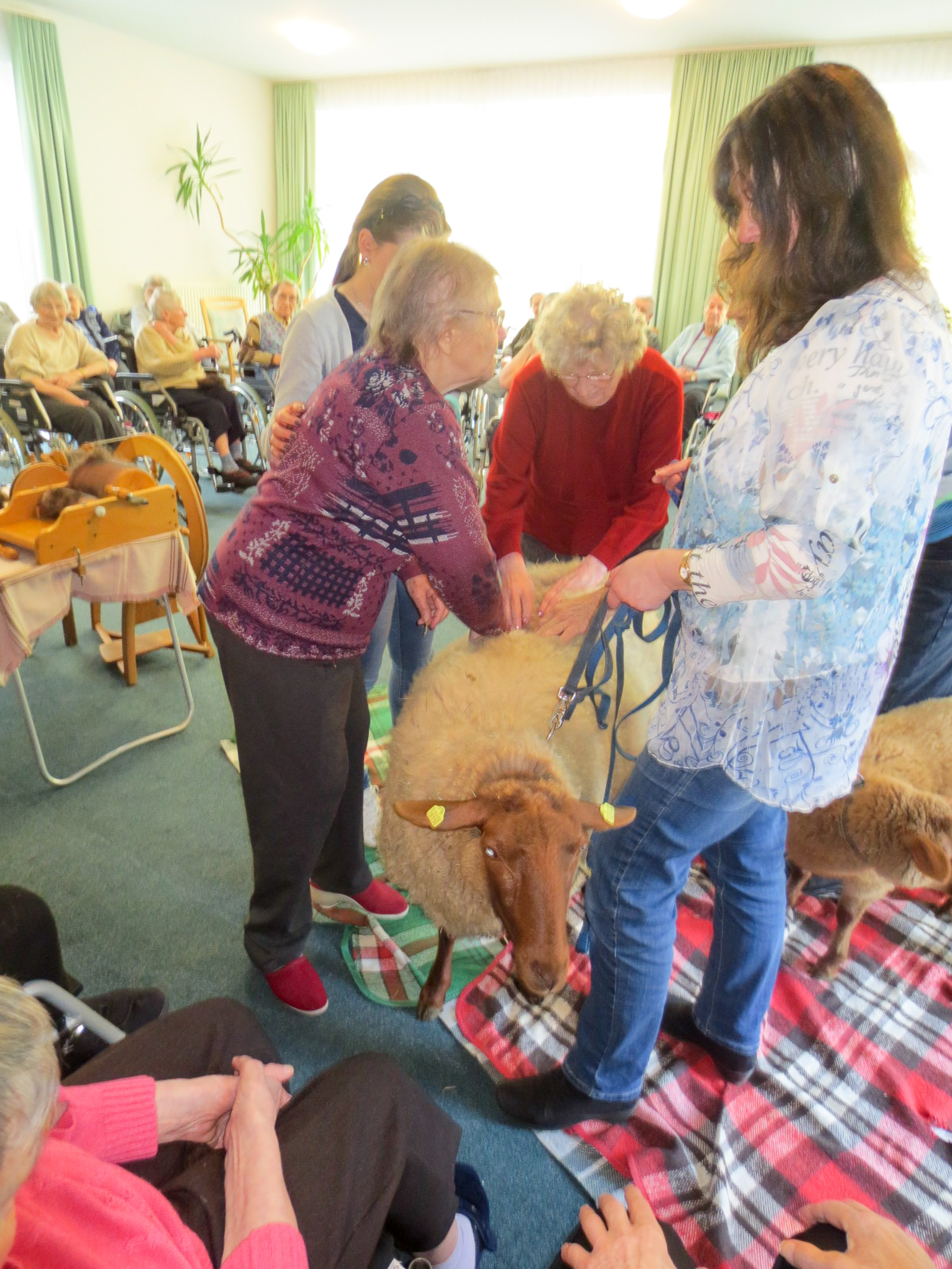 Schäfer Fiedler arbeitet gerne hautnah und erklärt ganz wunderbar, wie man Schafwolle bekommt, verarbeitet und was daraus entstehen kann. Die Bewohner dürfen auch selbst mal probieren, wie anstrengend es ist, Wolle zu kämmen und oder zu verspinnen. Bei jedem Besuch sind natürlich auch die „Hersteller“ der Wolle mit dabei. Sie bekommen an diesem Nachmittag Streicheleinheiten, die eine ganze Weile reichen dürften.