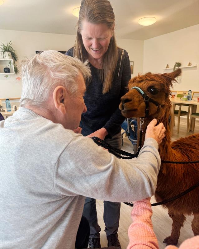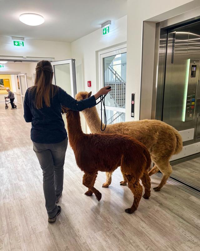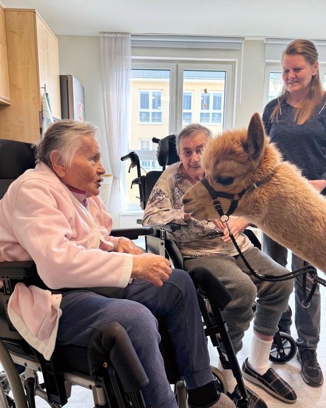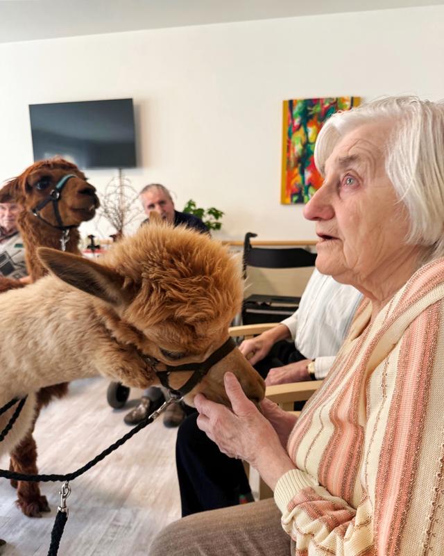 Ein besonderes Erlebnis für unsere Bewohner:innen: Der Besuch von Alpakas hat für viele strahlende Gesichter und wertvolle Momente gesorgt. Die beruhigende Ausstrahlung und das weiche Fell der Tiere bieten eine ganz besondere Erfahrung, die nicht nur Freude bereitet, sondern auch nachweislich das Wohlbefinden steigert. Besonders für sehbehinderte Senioren war es eine bereichernde Erfahrung, die sanften Tiere durch Berührung zu erleben.