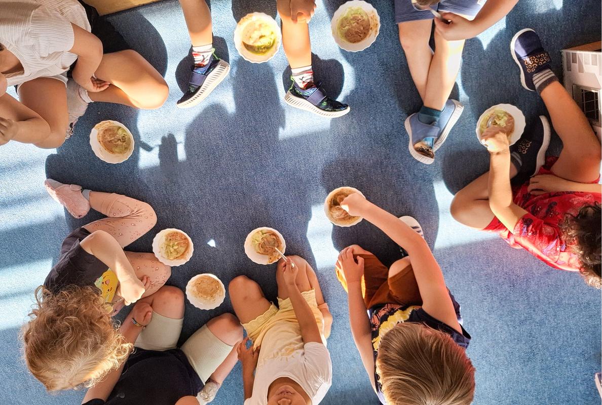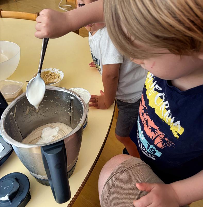 Die „Lila Gruppe“ der »Kita Sonnenbergstrolche« hat die letzten warmen Tage genutzt, um gemeinsam Eis zu machen – und natürlich auch zu naschen!
